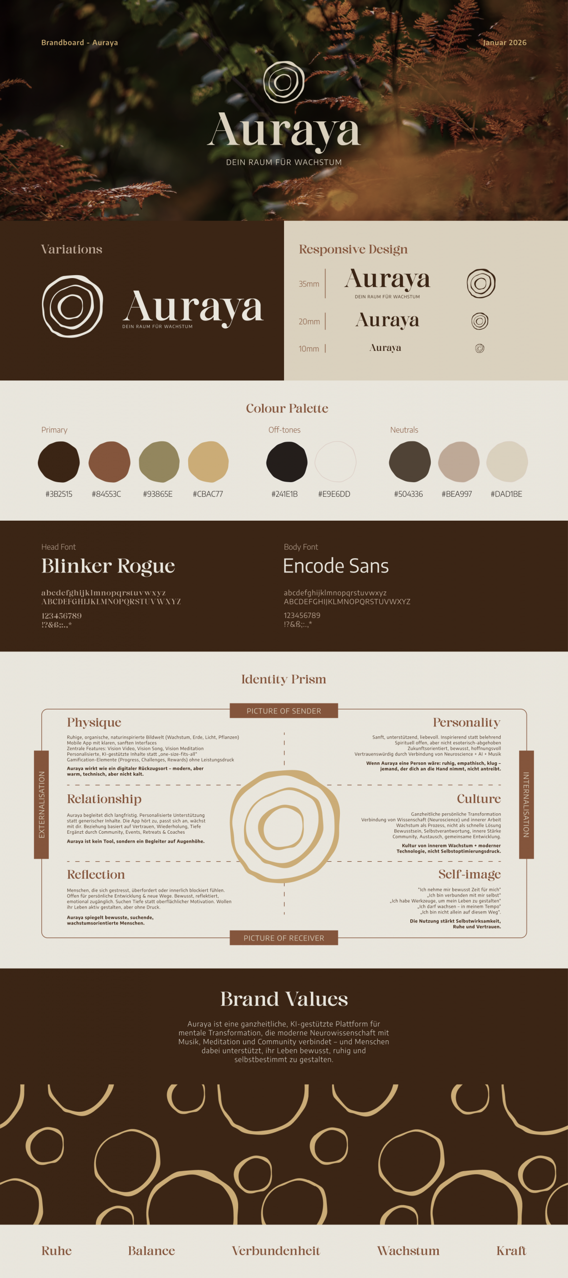 To clearly differentiate Auraya, the visual identity therefore focuses on warmer orange, red and brown tones, supporting the natural, earthy aesthetic defined in the CEO’s vision. The color system is designed to be flexible and adaptable. Off-white base tones, natural secondary colors and functional system colors remain consistent, while the primary seasonal color can shift subtly throughout the year.