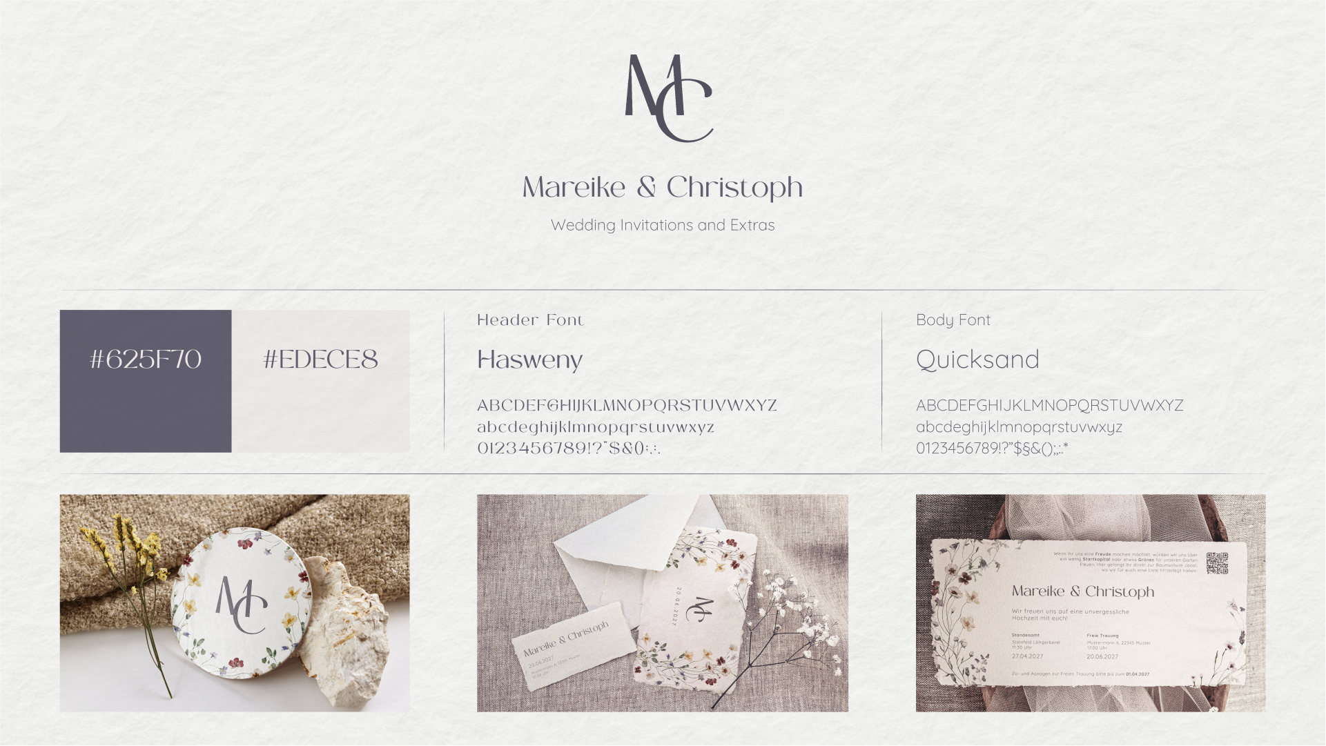 The first step was to find a suitable font and colours with which to create the initial designs. As I said, we were looking for a warm, rustic colour palette, with the flowers providing the actual colours. So I needed a font colour that would create enough contrast with the future paper, while also harmonising with the flowers. I therefore decided on a dark purple for the text.
