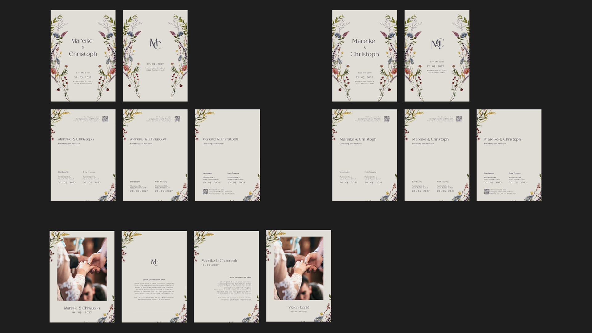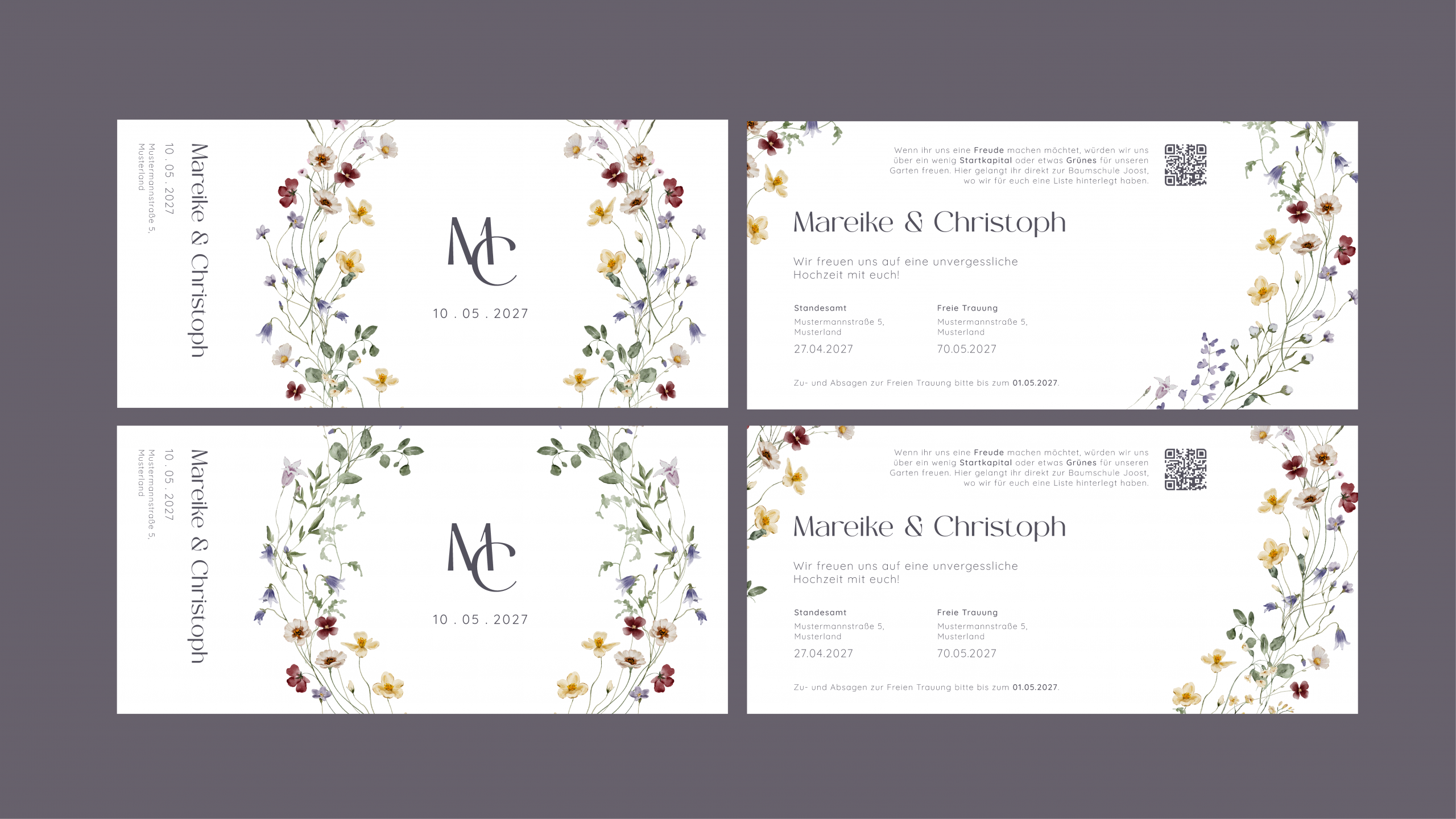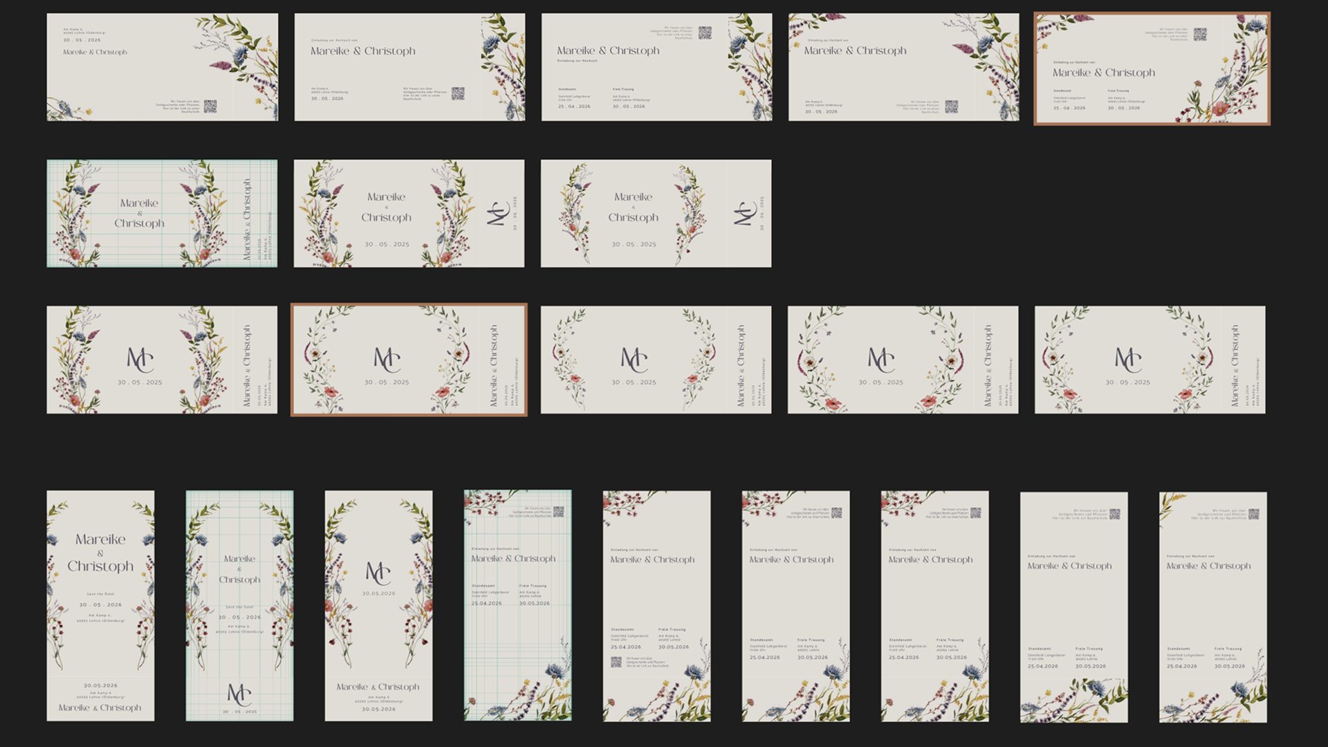 We decided on the horizontal format, which I then used as the base for further refinement, adapting the colour palette and floral illustrations accordingly.