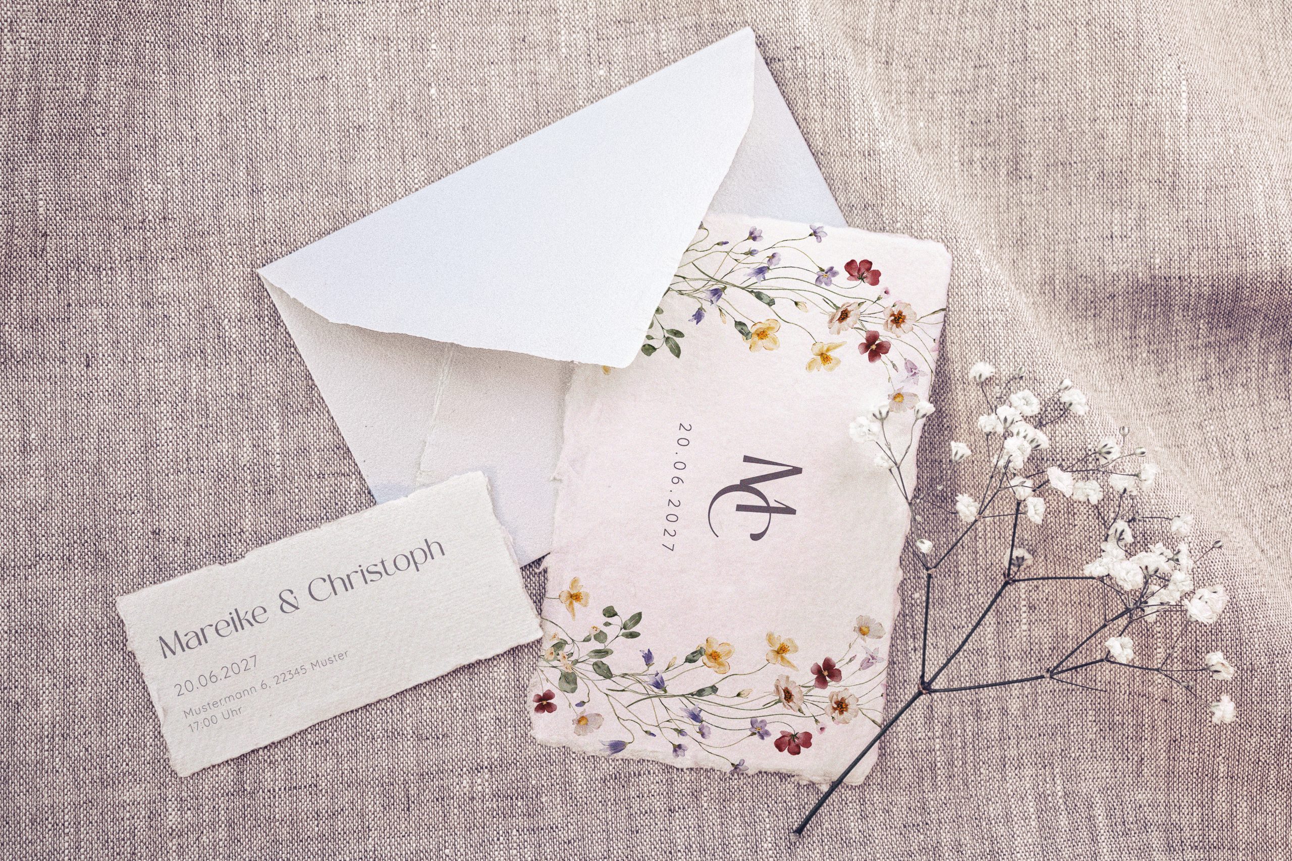 The requirements were that the invitation was supposed to be simple and easy without much schnickschnack, she only wanted the pure part that guests can hang on the fridge. The Bride liked the idea of natura, textured and rough paper with an organic, handcrafted feeling. Fitting to the theme and her dress, she wanted a bundle of wildflowers in a realistic waterclour- style in soft, slightly muted but colourful colours.