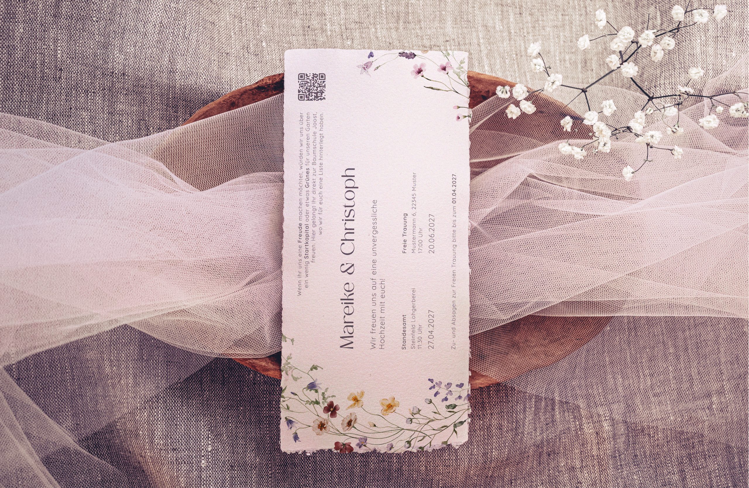 The smaller tear-off piece presents all essential information at a glance – who, where, and when – and features floral decorations on the back. If desired, the couple can also use this smaller section as a simple control or check-in element.